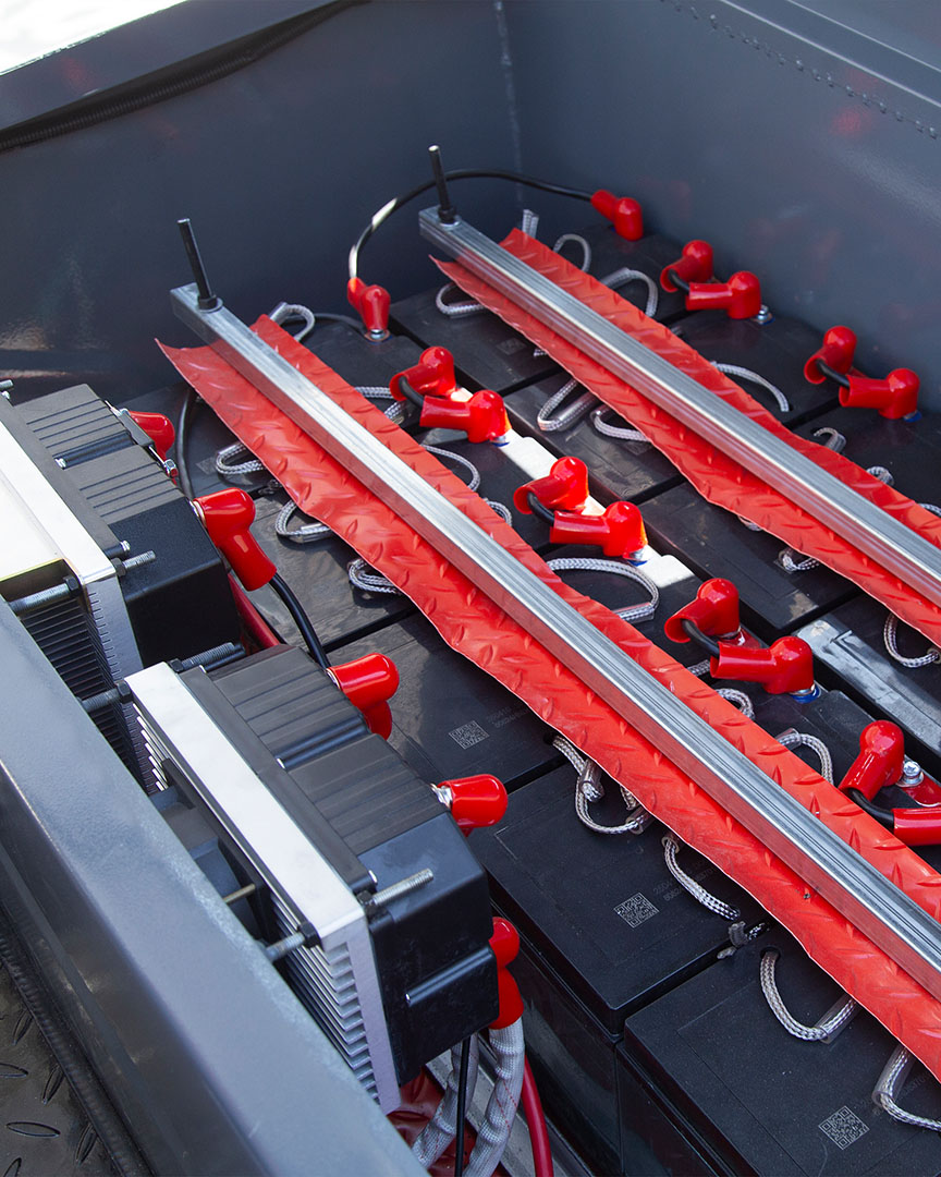 - Batería de 60V (10 Mudulos de 12V, en 2 Series de 5 Modulos) y 8400Wats, 8.4Kw, Proporciona hasta 6-8 horas de Trabajo Continuo.