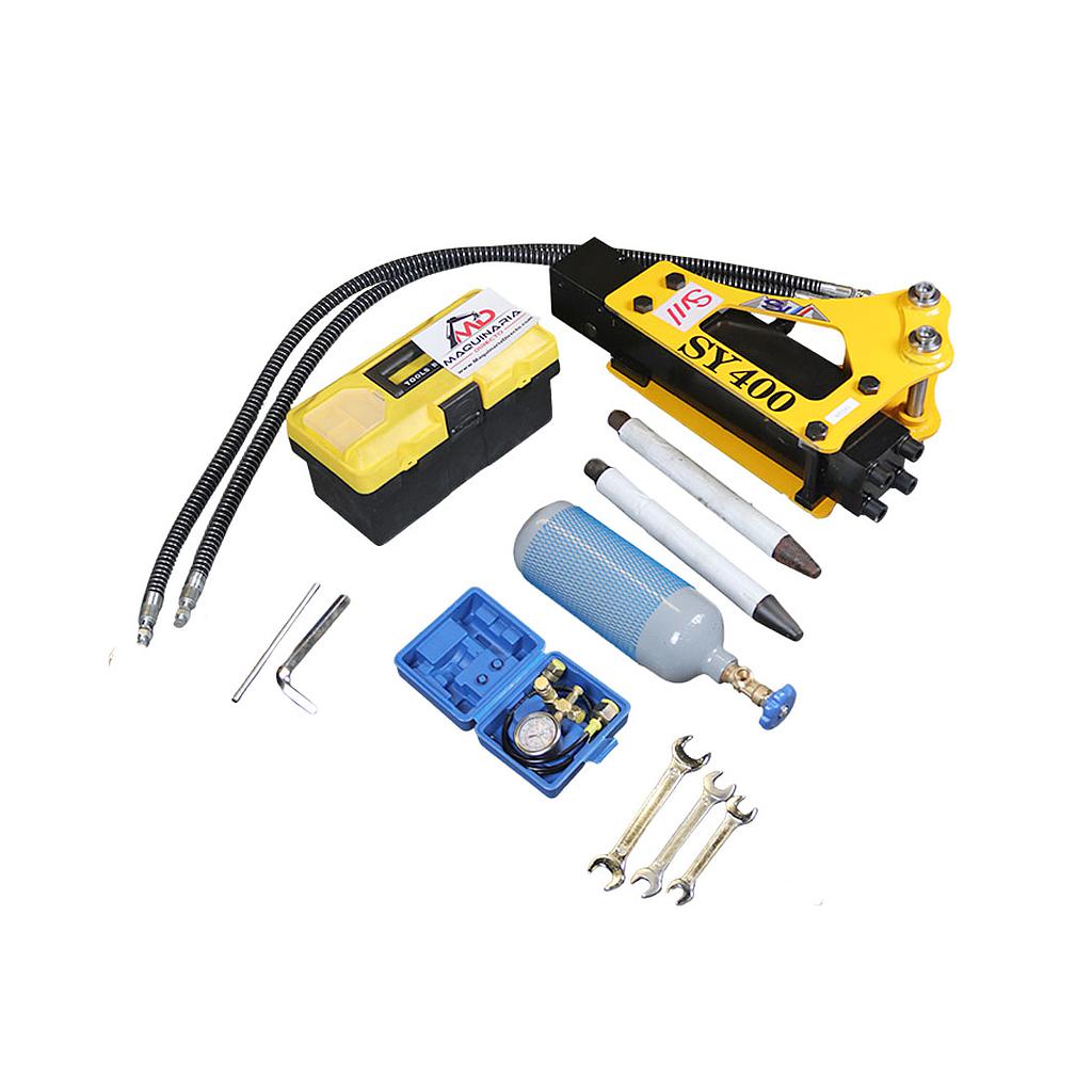Incluye Martillo, Dos Punteros, Latiguillos, Bulones de 25mm, Botella de Nitrogeno, Herramientas de uso y Manometro de Control de Presion.