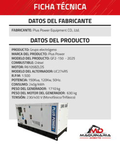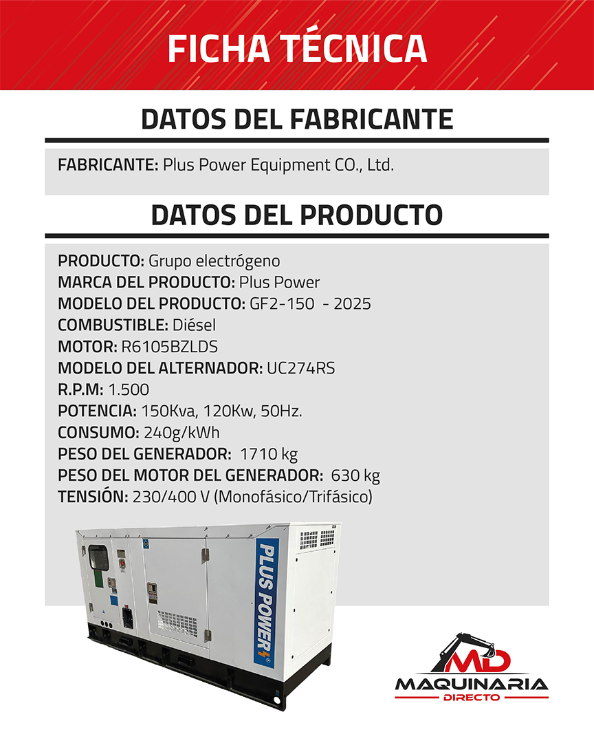 El Plus Power GF2-150 – 2025 es un Generador Diésel de 150 kVA (120 kW), Diseñado para Ofrecer Energía Continua, Fiable y Eficiente en Industrias o Como Respaldo Eléctrico. Cuenta con Panel de Control Digital y su Estructura Robusta Soporta un Peso Total de 1.710 kg (Motor 630 kg), Garantizando Durabilidad y Facilidad de Operación en Entornos Exigentes.
