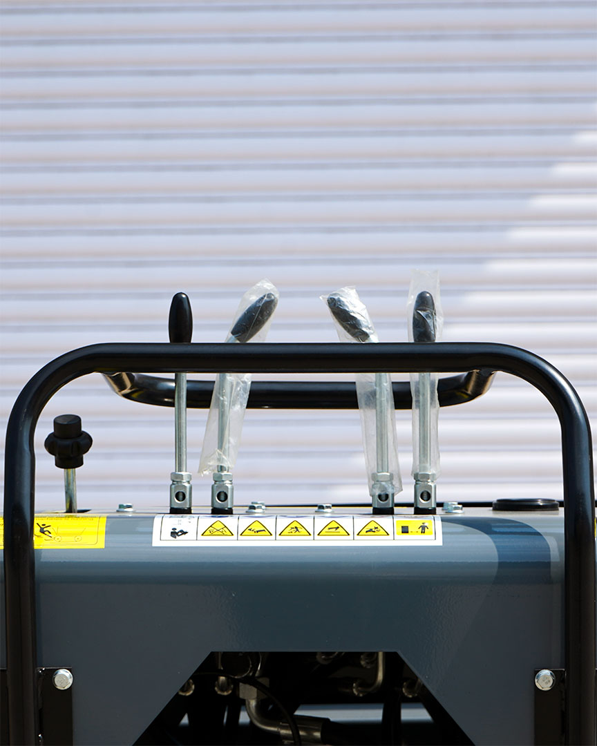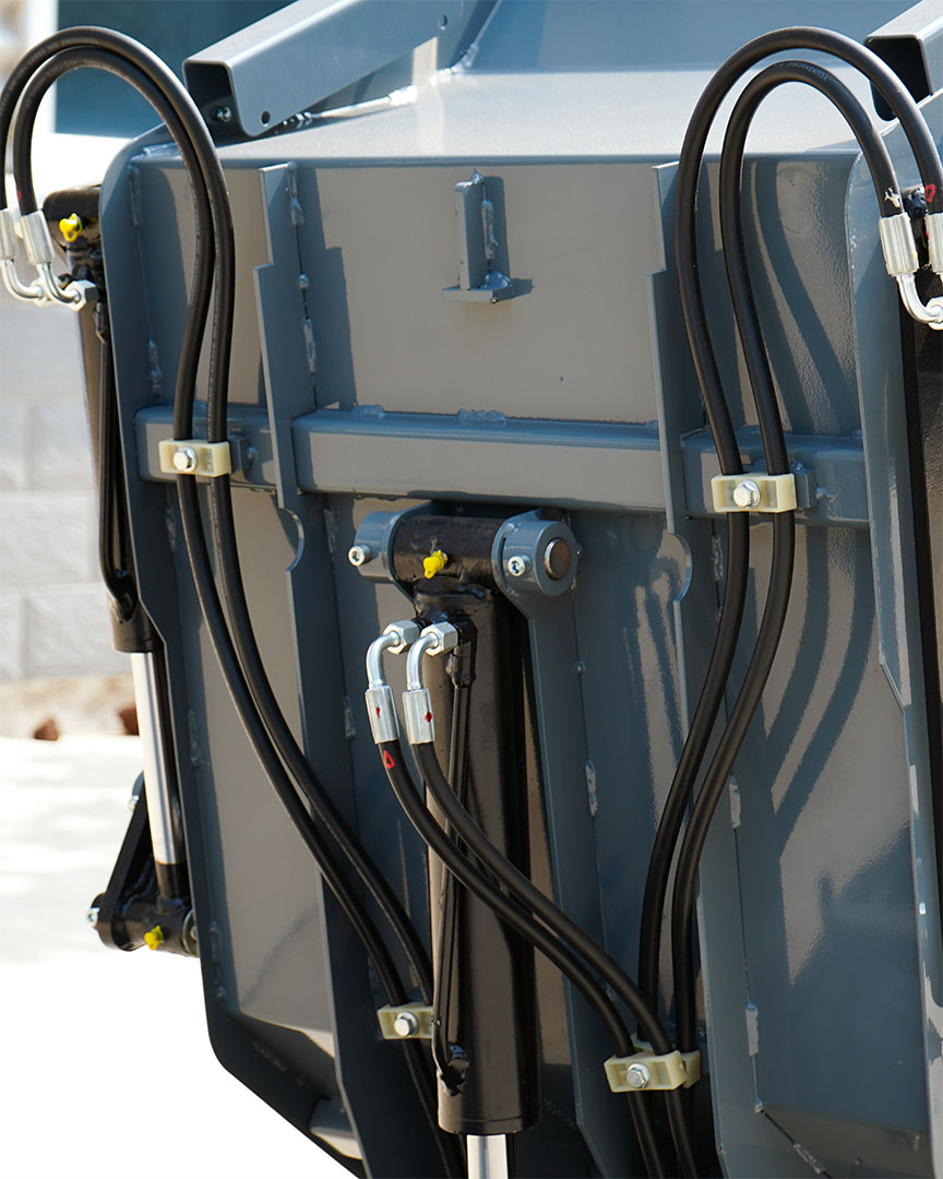 Construcción Robusta. Tolva de Acero Grueso y Cilindro Hidráulico Protegido para Mayor Durabilidad y Resistencia.