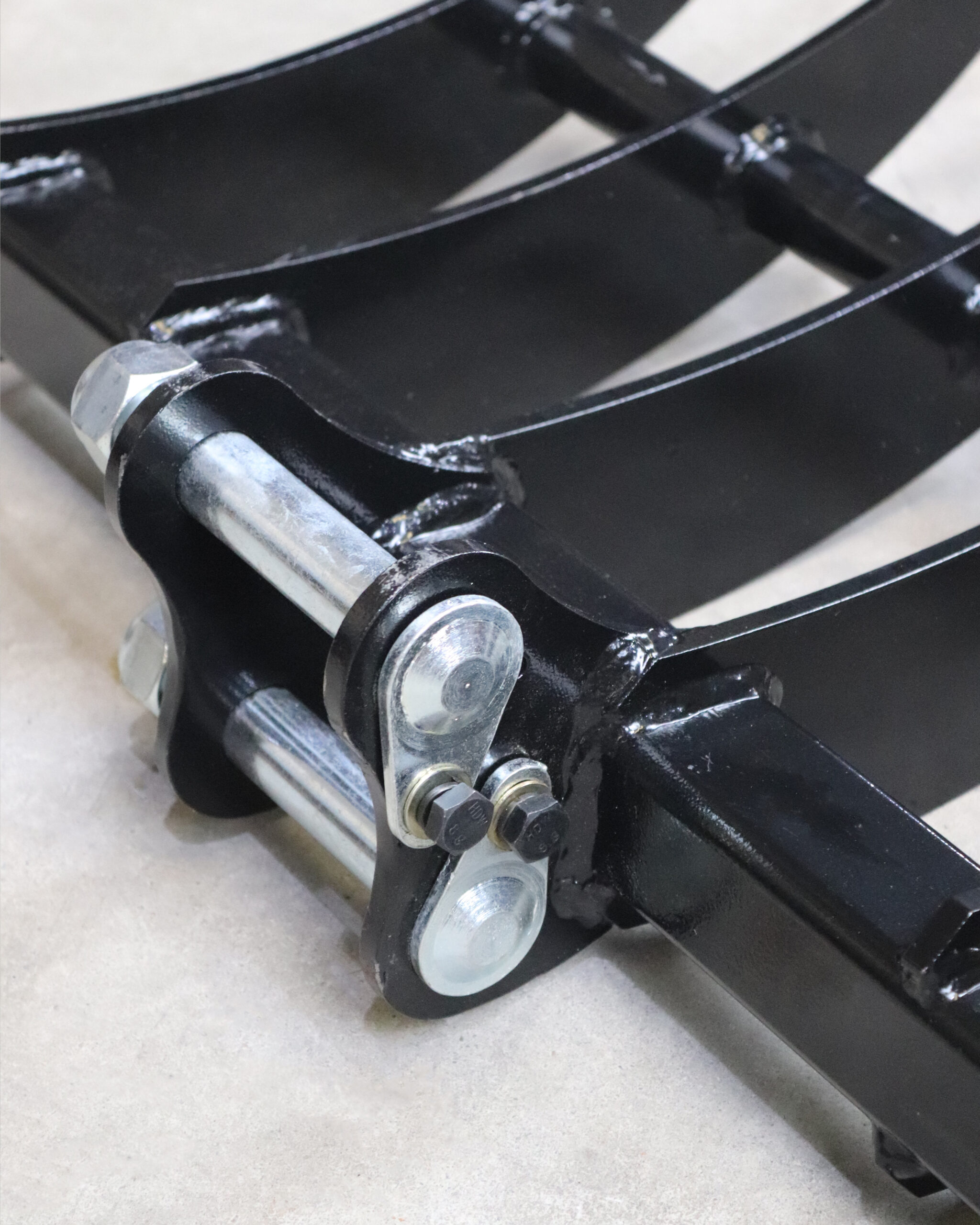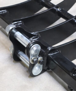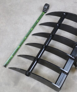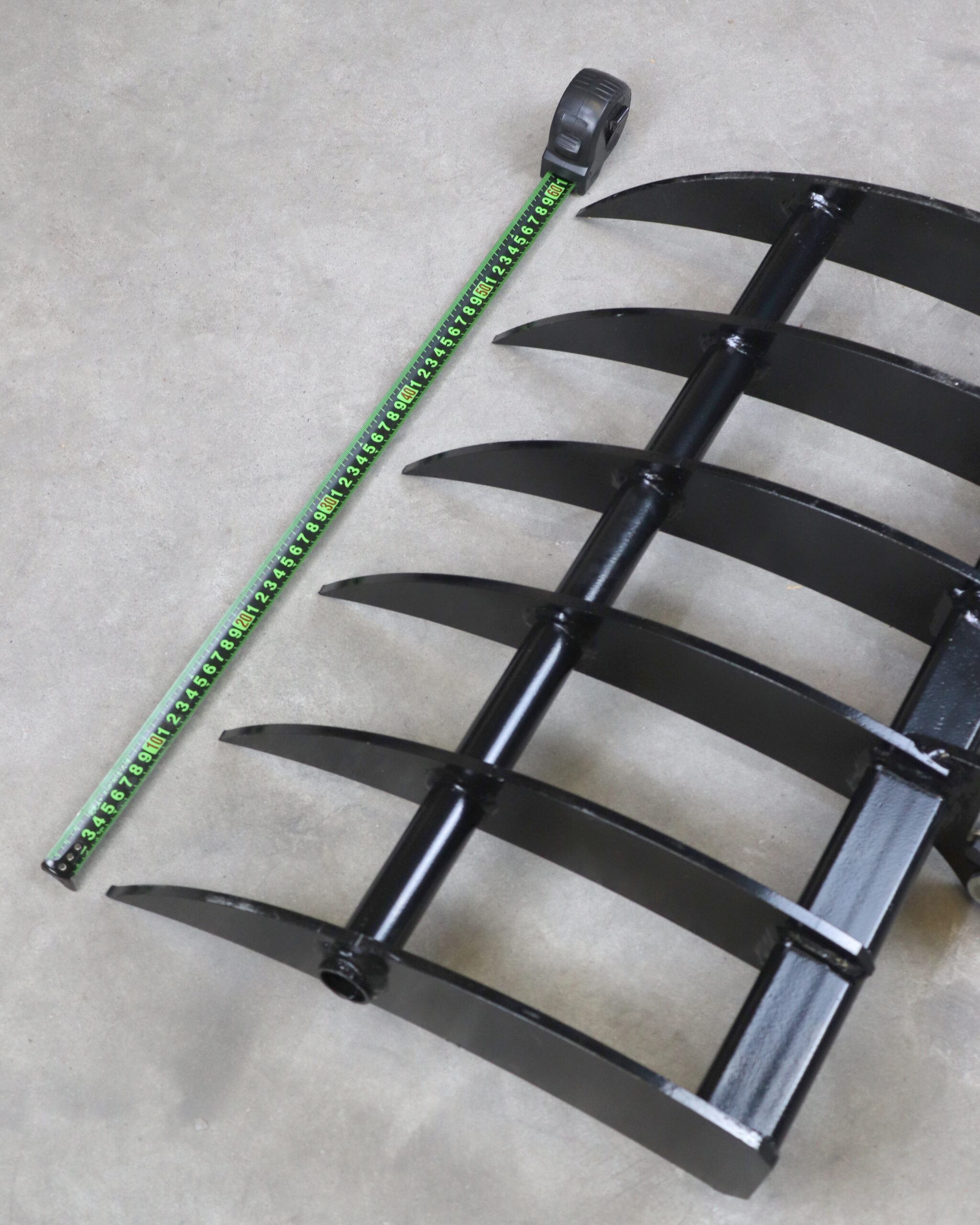 Rastrillo para Pins o Burlones de 25mm, con un Perfil Curvo para Excavar o Cribar y Puntas Puntiagudas para una Penetración Máxima, el Rastrillo de 60 centímetros es un Accesorio para Excavadoras que se Utiliza para Limpiar Terrenos, Recoger Desechos, y Clasificar Materiales.