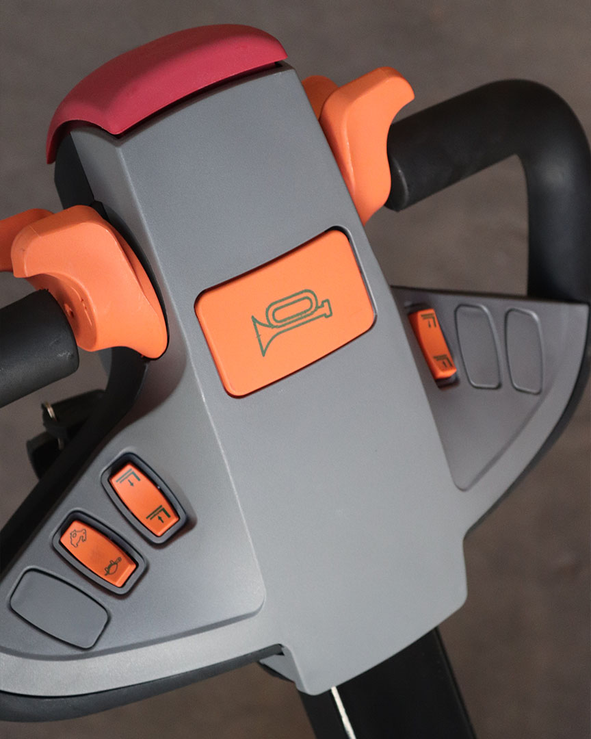 Cuando el timón está en posición vertical (levantado), la máquina bloquea la tracción eléctrica por seguridad para evitar movimientos involuntarios cerca del operario. Para maniobrar en espacios reducidos o ajustar la posición del equipo, existe el “modo tortuga” (o de velocidad lenta). Al activarlo, el motor permite un avance o retroceso controlado a baja velocidad incluso con el timón vertical.